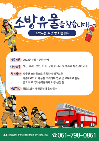 이를 위해 광양소방서는 소방유물 찾기 포스터를 제작해서 알리고 있으며 소방유물을 기증하기를 원하는 모든 사람들은 광양소방서로 유물을 기증할 수 있다. 소방유물은 소방 관련 사진을 비롯해서 문서, 장비, 배지 등 크기 및 종류에 상관없이 기증할 수 있다.